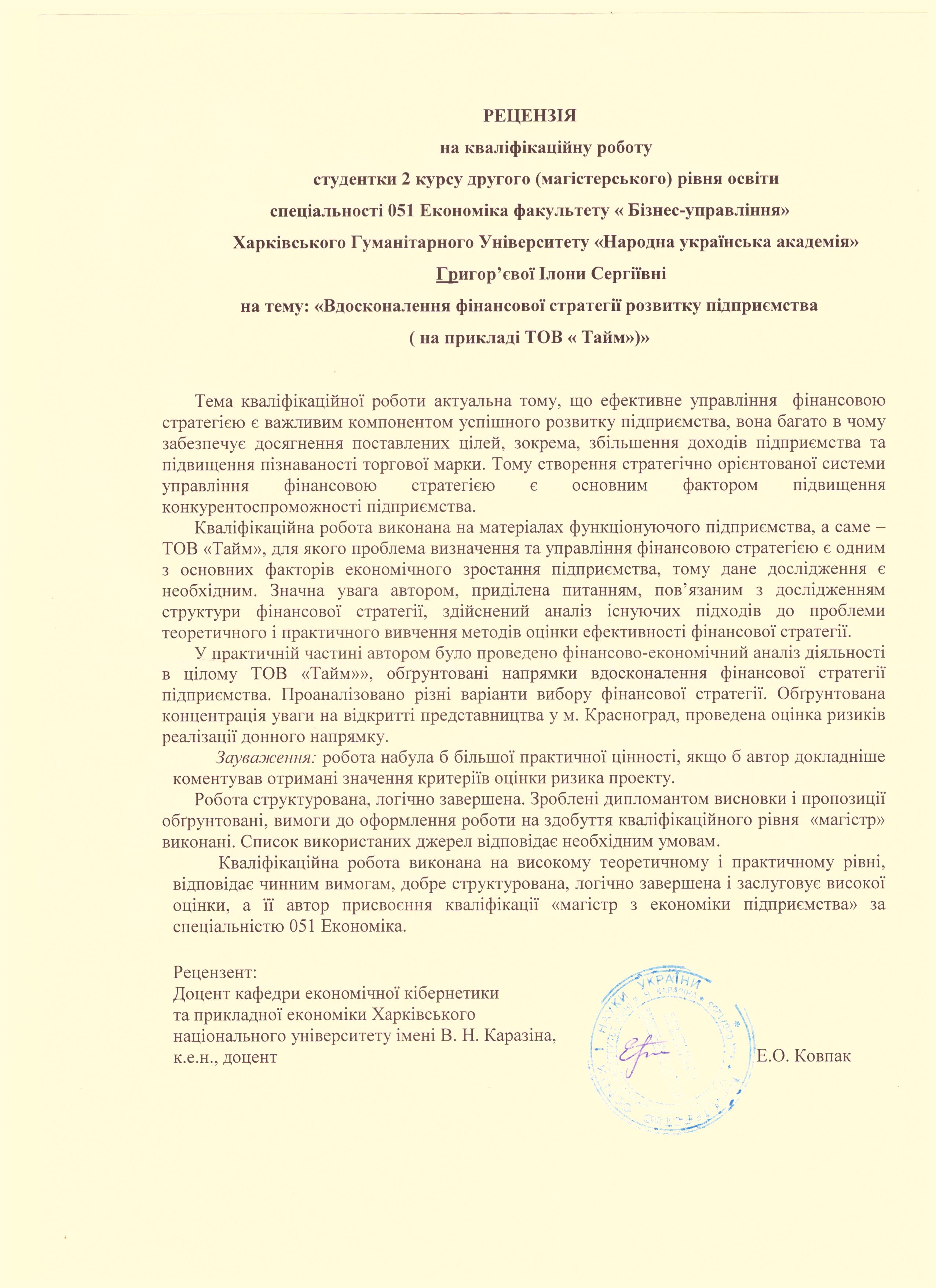 | Библиографическое описание: | Григорьєва, І. С. (2021). Вдосконалення фінансової стратегії розвитку підприємства (на прикладі ТОВ «Тайм»). Харків: ХГУ «НУА». |