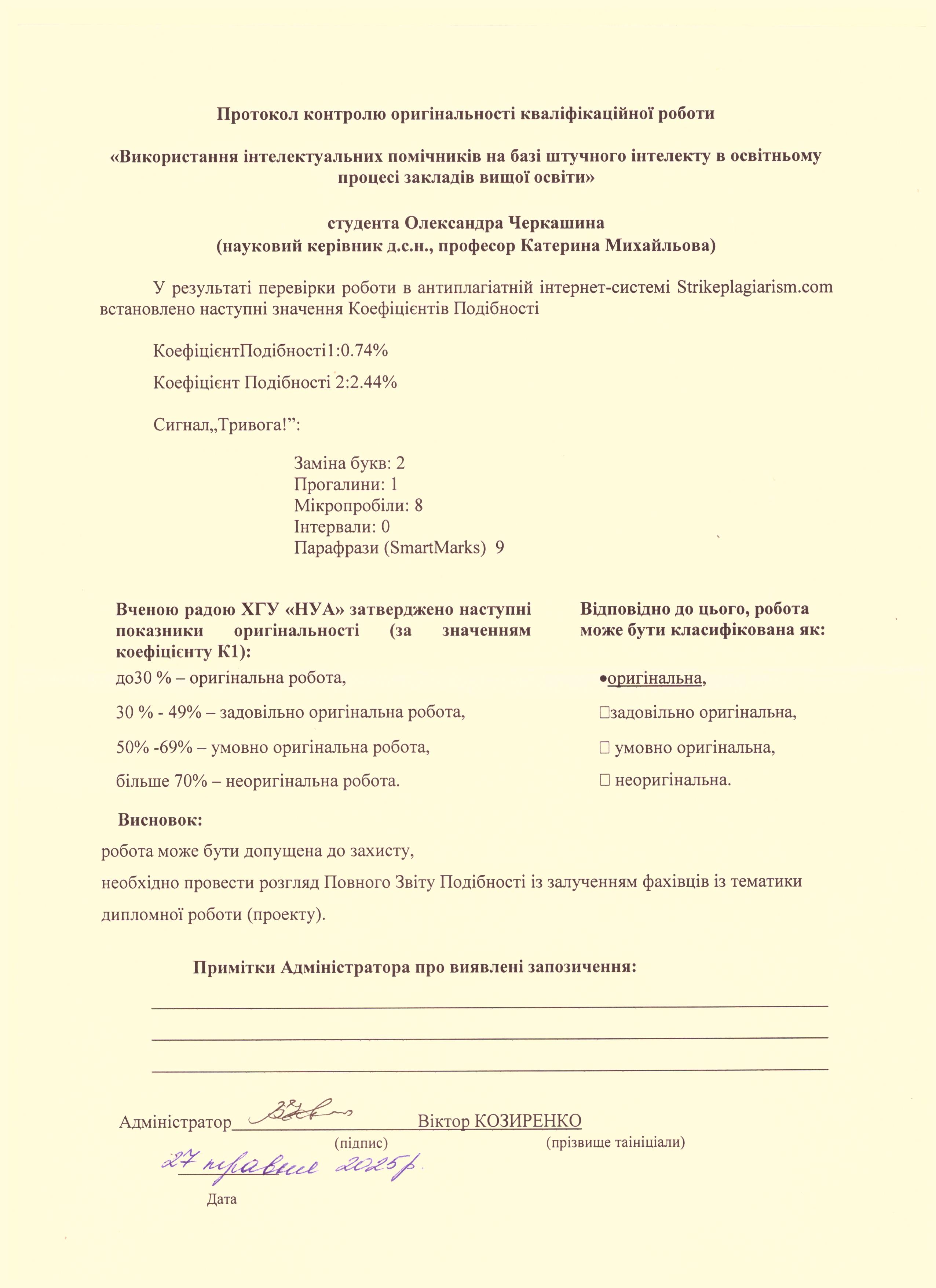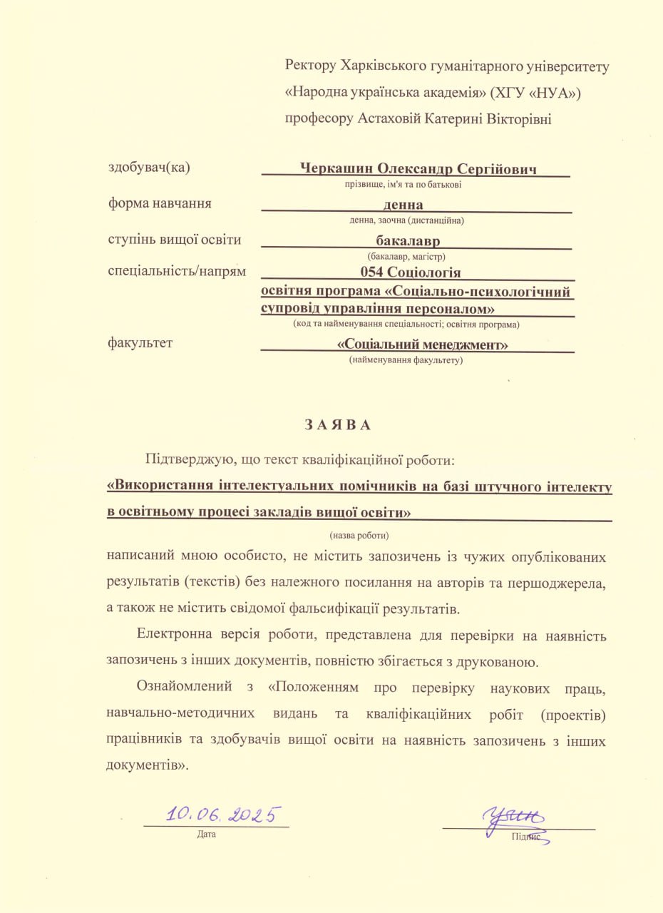 | Библиографическое описание: | Черкашин, О. С. (2025). Використання інтелектуальних помічників на базі штучного інтелекту в освітньому процесі закладів вищої освіти. Харків: ХГУ «НУА». |