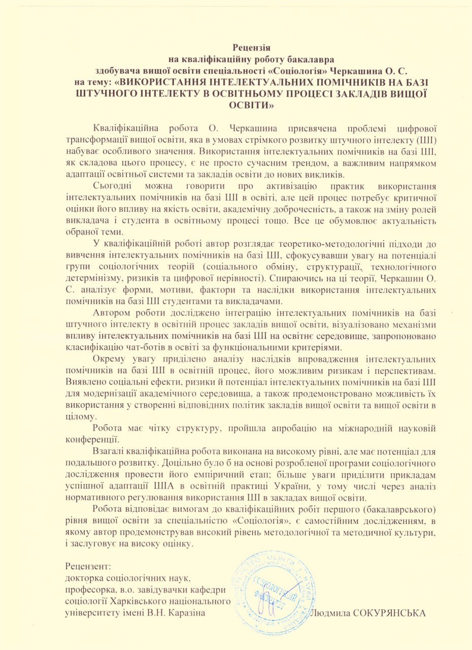 | Краткий осмотр (реферат): | У кваліфікаційній роботі досліджено інтеграцію інтелектуальних помічників на базі штучного інтелекту (ШІА) в освітній процес закладів вищої освіти. Використовуючи соціологічні теорії соціального обміну, структурації, технологічного детермінізму, ризиків та цифрової нерівності, проаналізовано формати, мотиви, фактори та наслідки використання ШІА студентами та викладачами. Візуалізовано механізми впливу ШІА на освітнє середовище, запропоновано класифікацію чат-ботів в освіті за функціональними критеріями. На основі вторинного аналізу міжнародних досліджень виявлено соціальні ефекти, ризики й потенціал ШІА щодо трансформації академічного середовища, а також можливість їх використання у формуванні політик вищої освіти. |